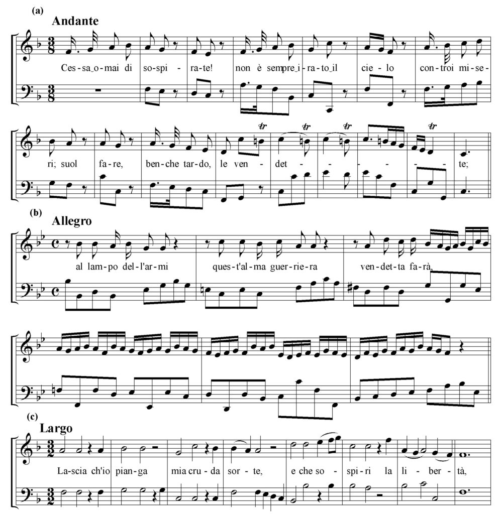 Ex. 5.4 Handel, arias, voice and basso continuo parts only: (a) “Cessa omai di sospirare” from Giulio Cesare (London, 1724); (b) “Al lampo dell’armi” from Giulio Cesare; (c) “Lascia ch’io pianga” from Rinaldo (London, 1711)