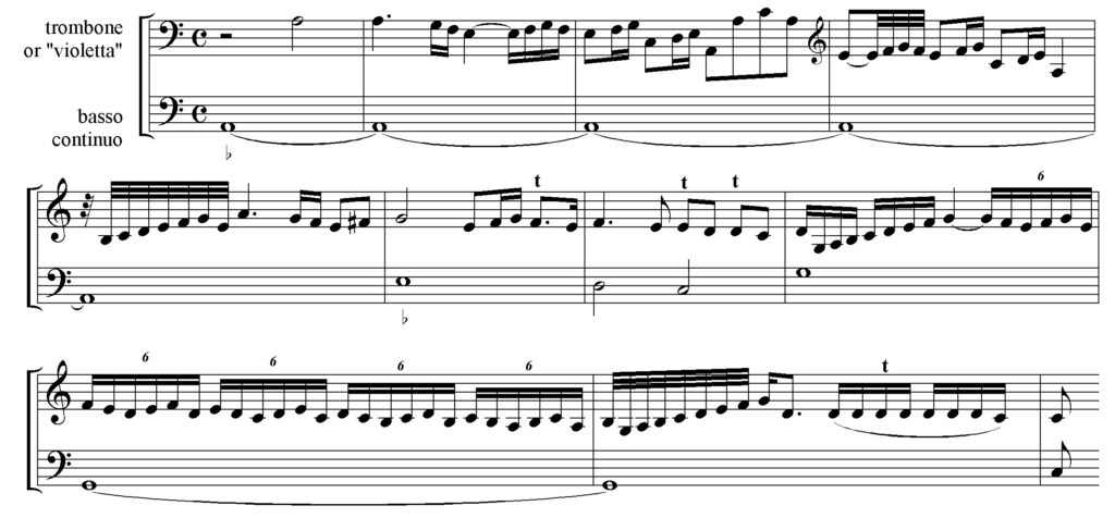 Ex. 8.66 Improvisatory bridge passage (“Trombon solo”) from Dario Castello, Sonata 12 for two unspecified treble instruments, trombone or “violetta,” and basso continuo, from Sonate concertate, book 2 (Venice, 1629)